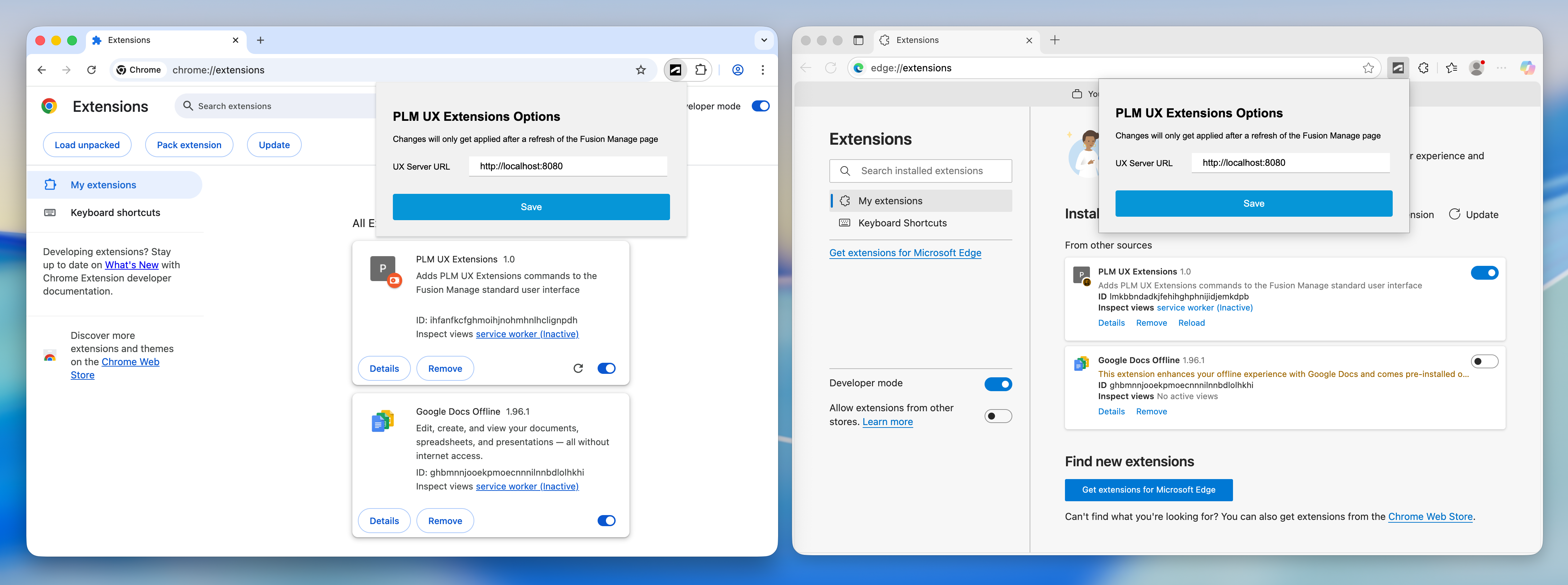 Ensure that the URL of your PLM UX Extensions server is listed in here. Note that while you can list multiple PLM UX Extensions servers in here, only one can be active. The active server is selected in the options dialog of the Chrome Extension as described in a later step. To install this package as next step, open the Extensions control of your browser by opening the address chrome://extensions either in Google Chrome or Microsoft Edge: